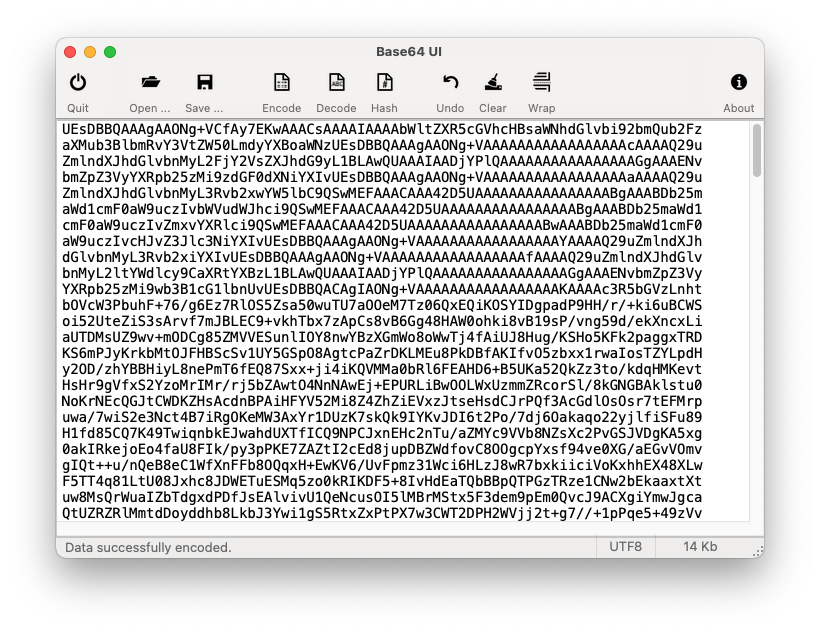 Eine besondere Stärke liegt in der Verarbeitung von Binärdaten und großen Dateien. Als Desktop Anwendung hat Base64 UI Zugriff auf das Dateisystem und kann somit problemlos große Dateien, wie ZIP Archive oder Videos und Fotos öffnen und kodieren. Aufgaben, an denen die meisten Online Konverter scheitert.
